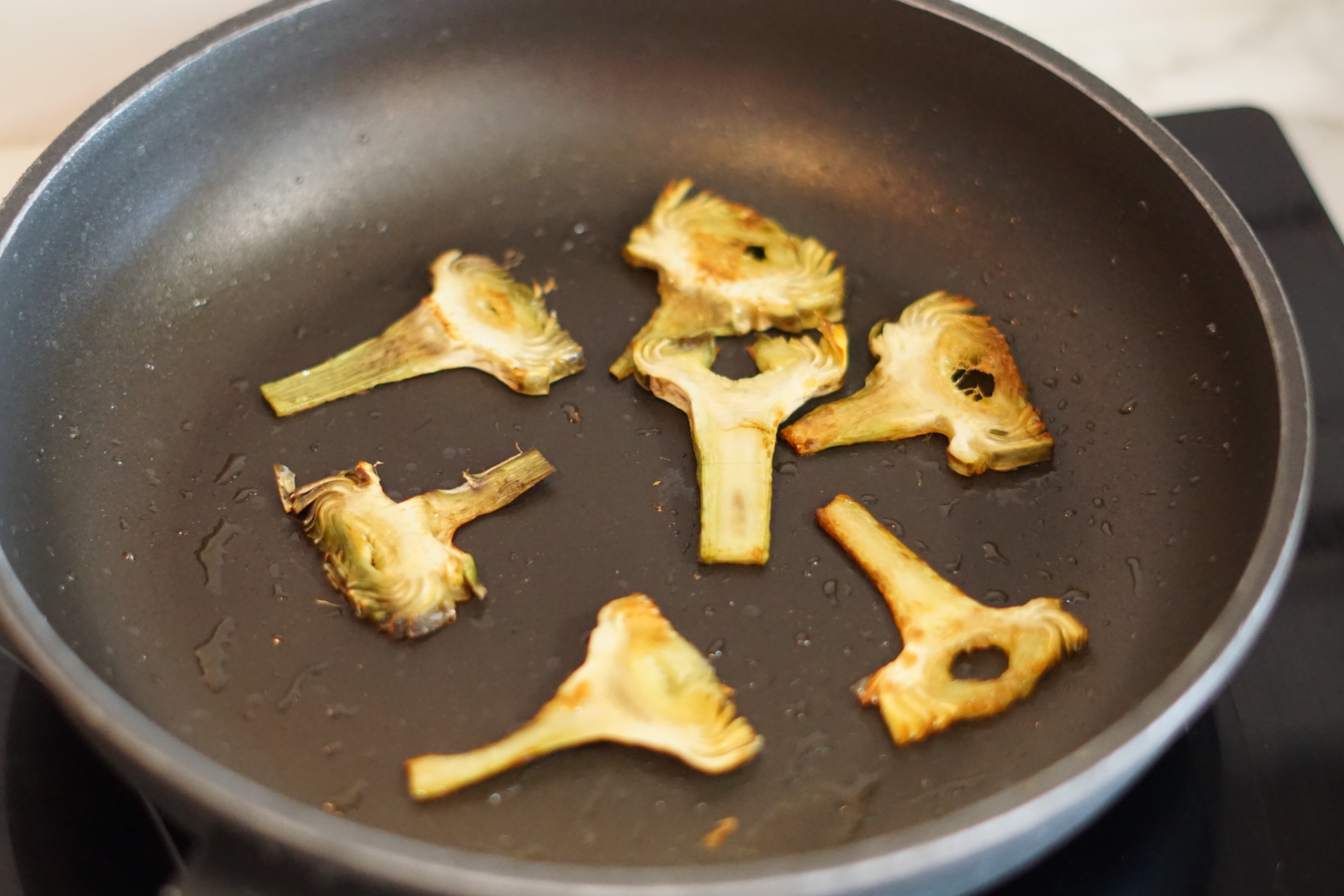 2. Cook the artichoke slices in a pan with olive oil until golden on both sides.