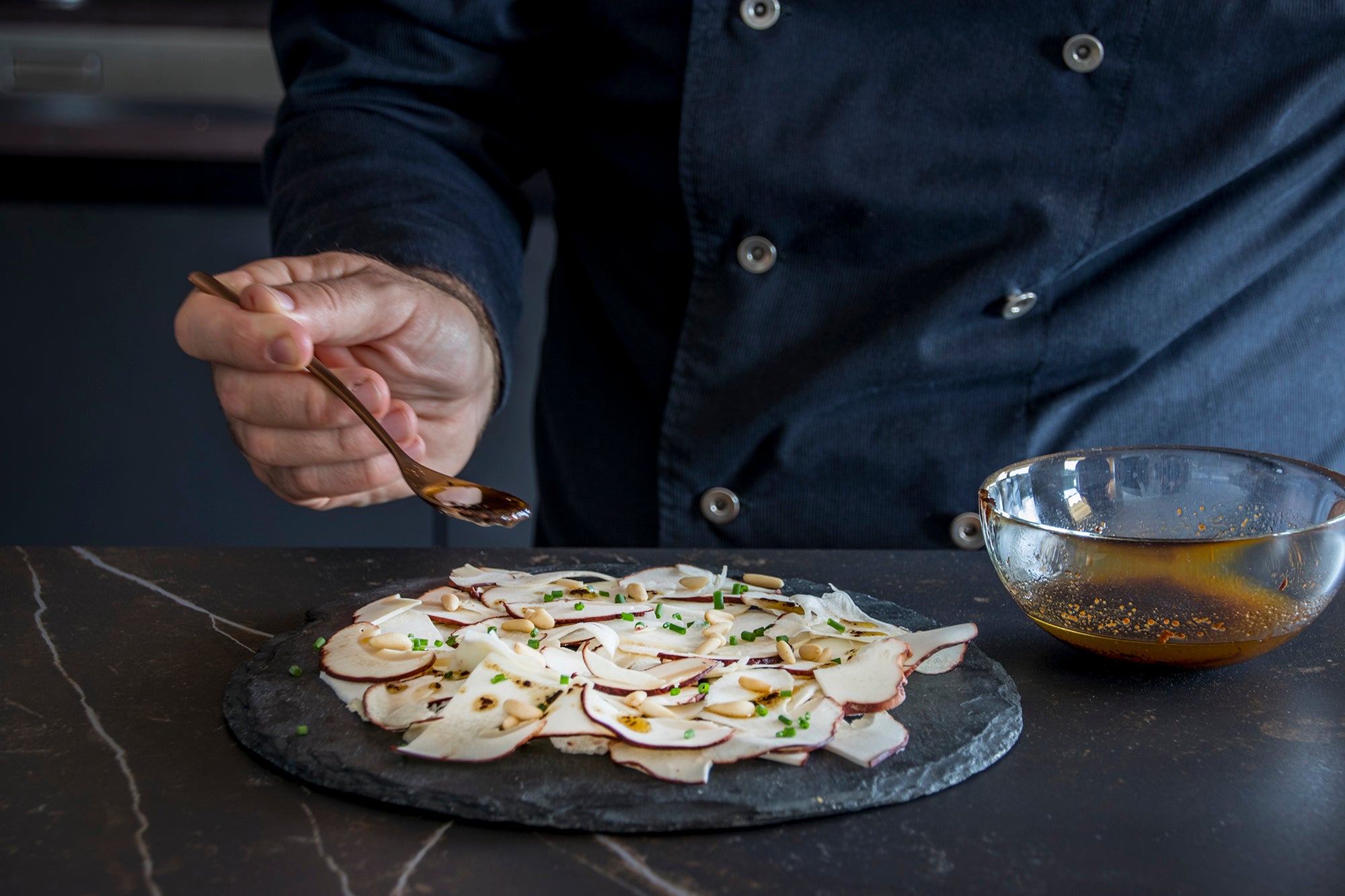 This elegant and delicate boletus carpaccio is enhanced by the unmistakable flavour of Laumont White Truffle vinegar. Perfect as a gourmet starter, it highlights the natural umami of the boletus with a refined vinaigrette made from Laumont’s mushroom flour and top-quality olive oil. A soft egg yolk completes the dish, adding richness and creaminess to each bite.