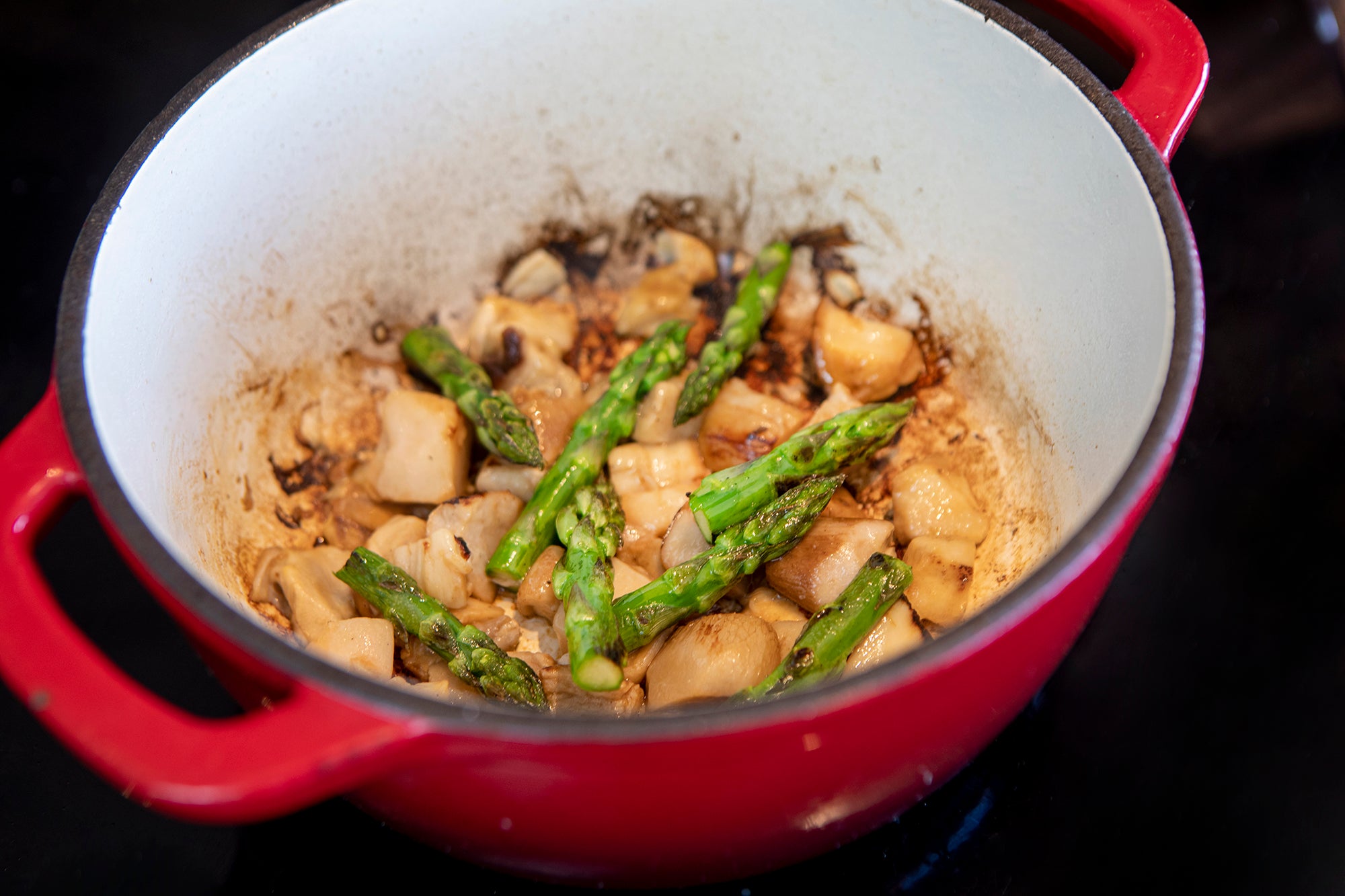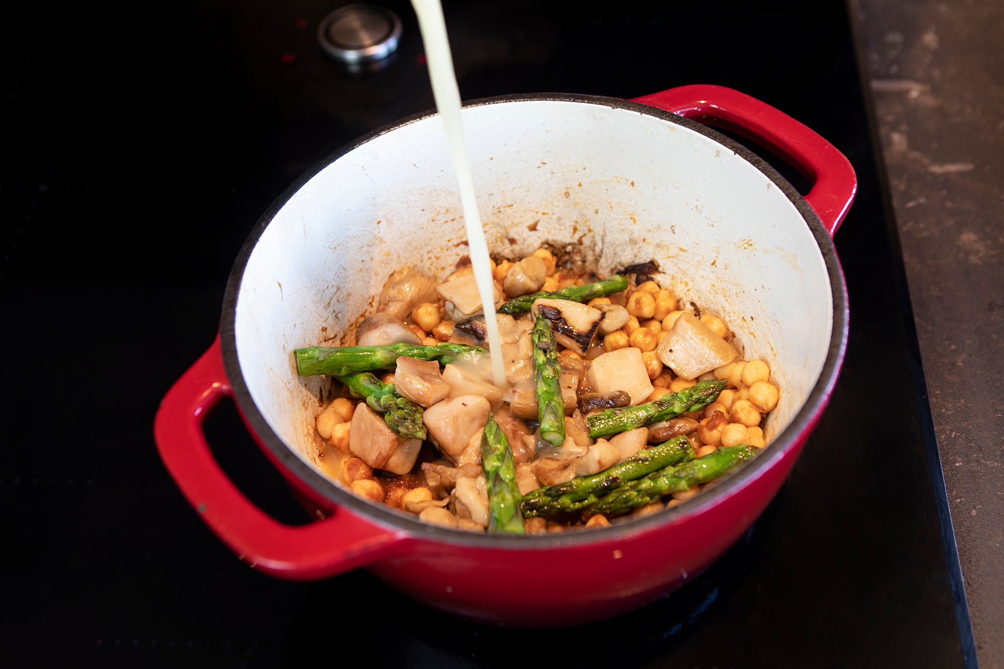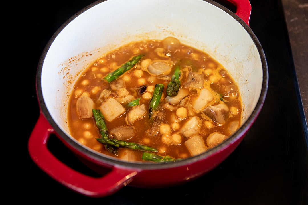 A hearty and comforting stew combining tender chickpeas with earthy boletus mushrooms and fresh asparagus, enhanced by a rich sofrito base.