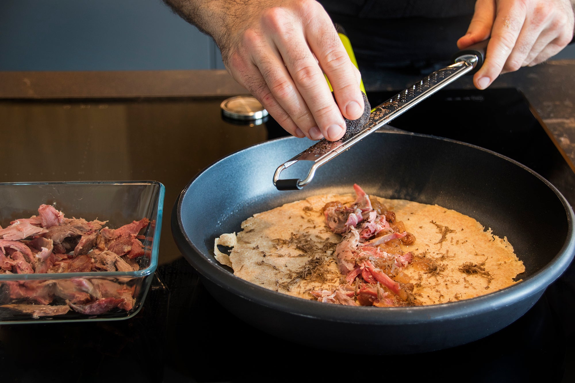 This refined savoury crepe brings together the melting richness of duck confit with the delicate sweetness of pear jam and the unmistakable aroma of Laumont premium black truffle. A gourmet twist on a classic, ideal for elegant brunches or festive meals.
