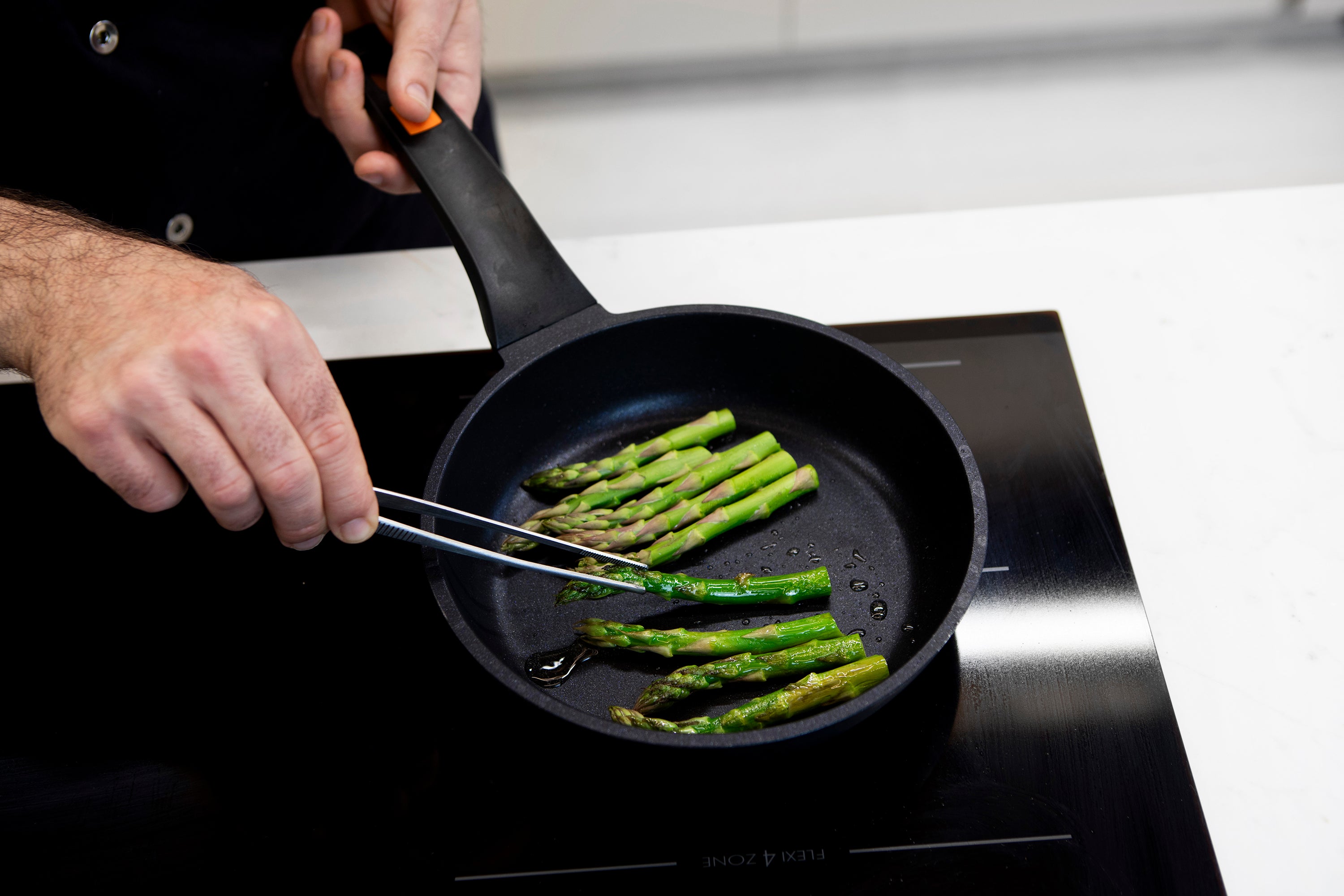 Start by cooking the asparagus in a pan with olive oil until golden and tender.