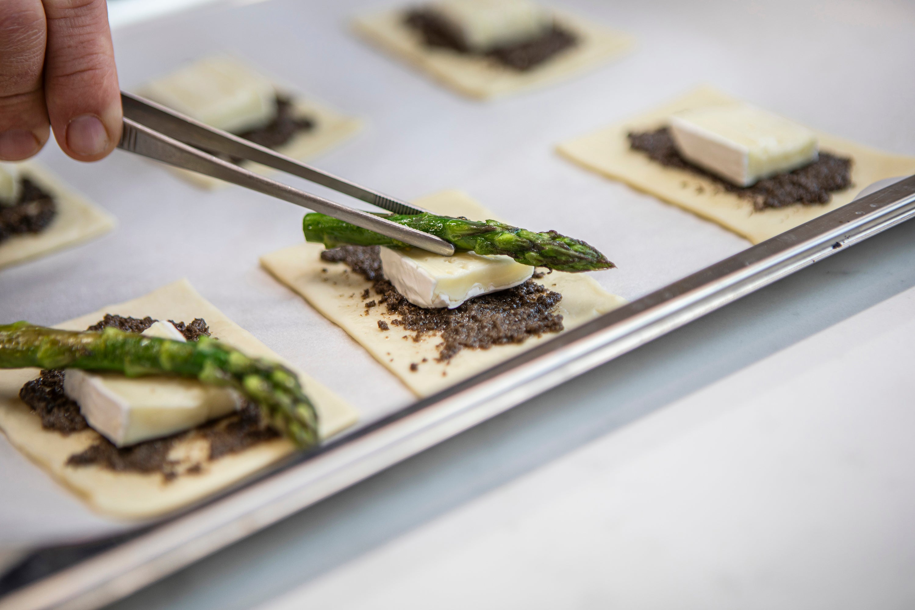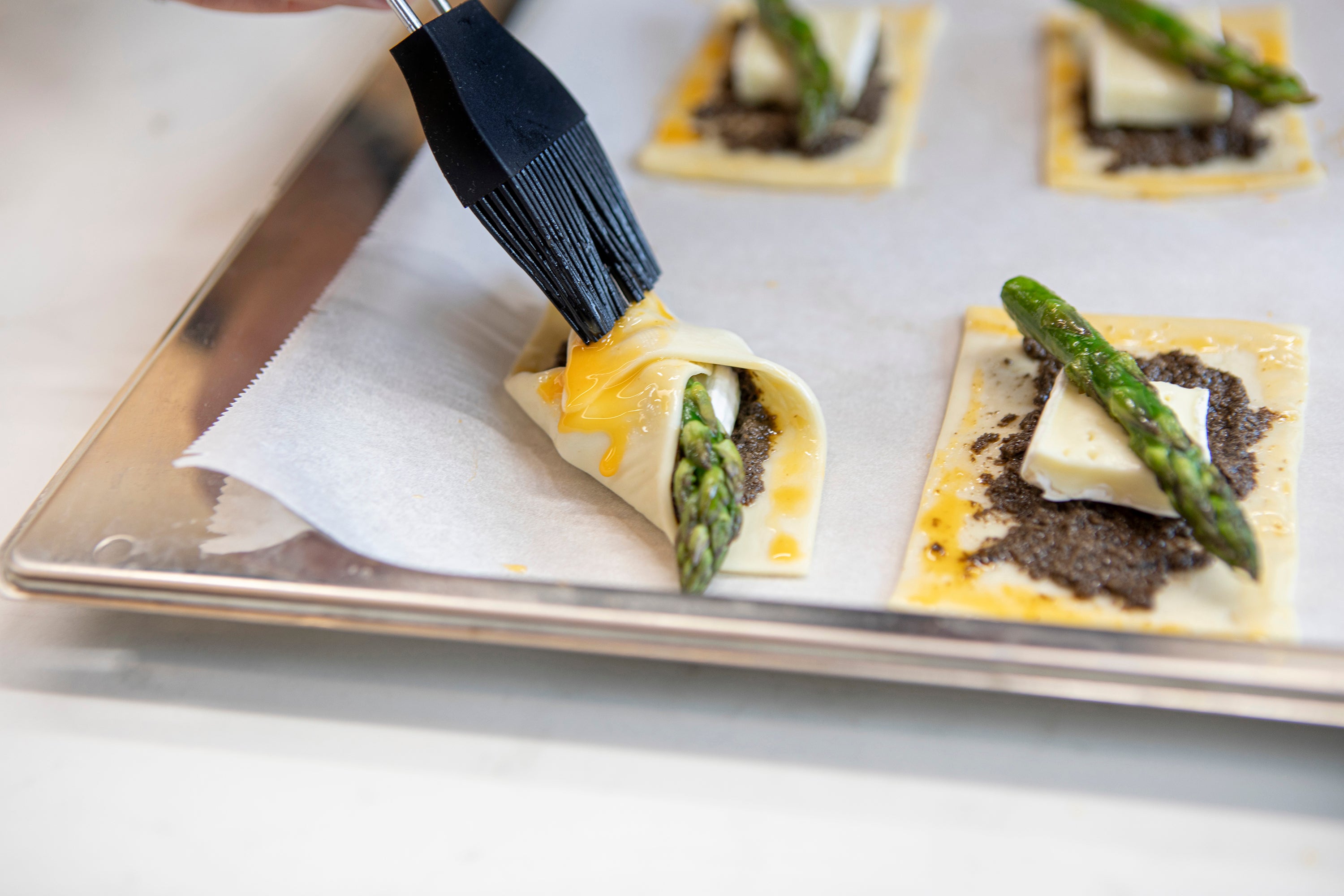 Step-by-step for puff pastry with truffled olive spread, brie, and asparagus