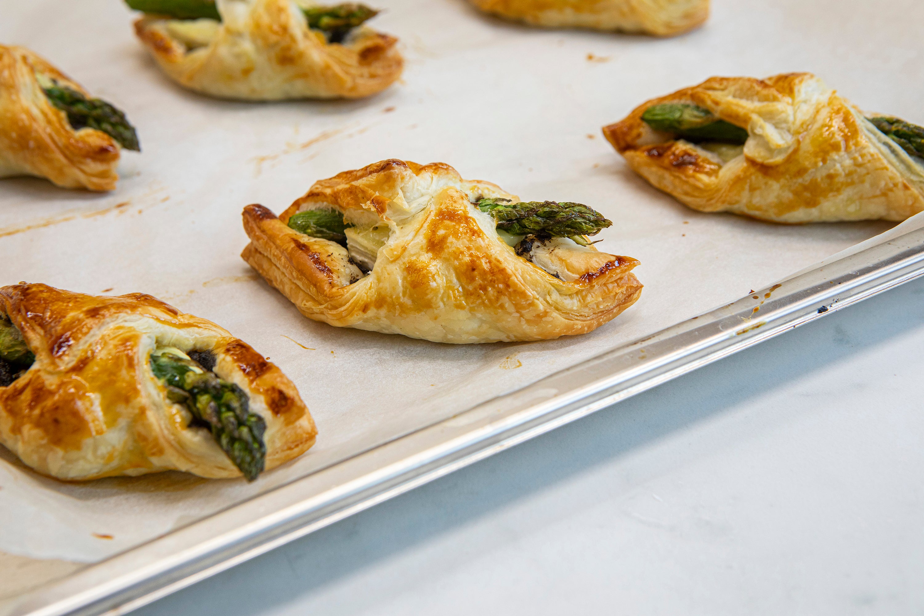 Puff Pastry with Brie, Truffled Olive Spread, and Asparagus