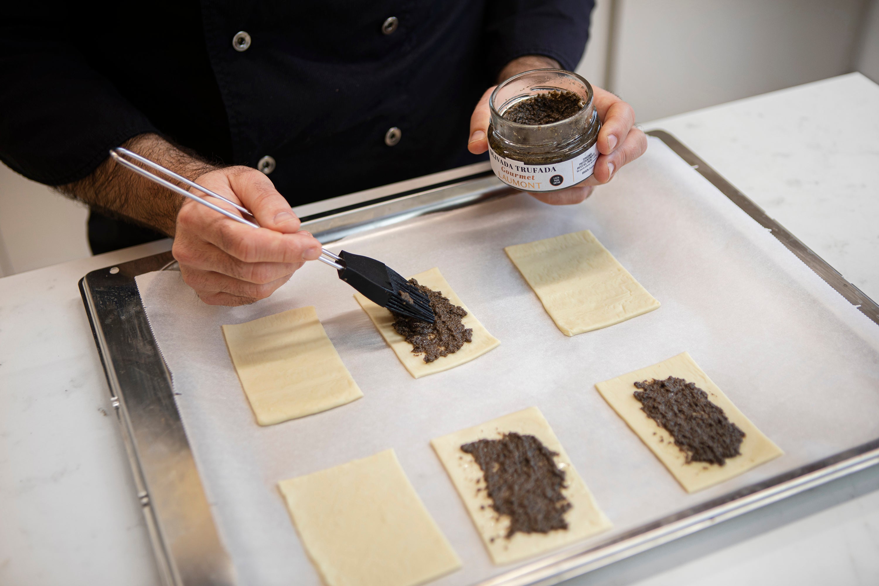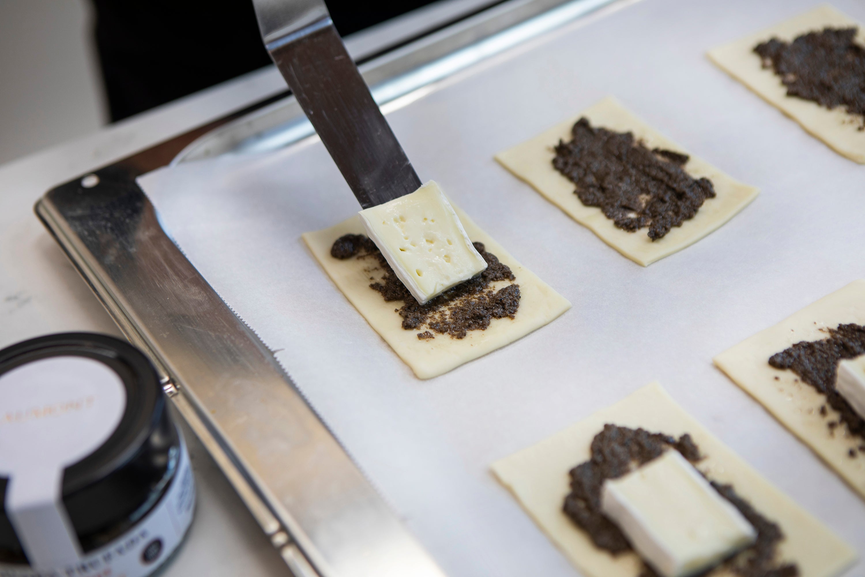 2. Place a layer of truffled olive spread in the center of each pastry piece, leaving the edges clean.