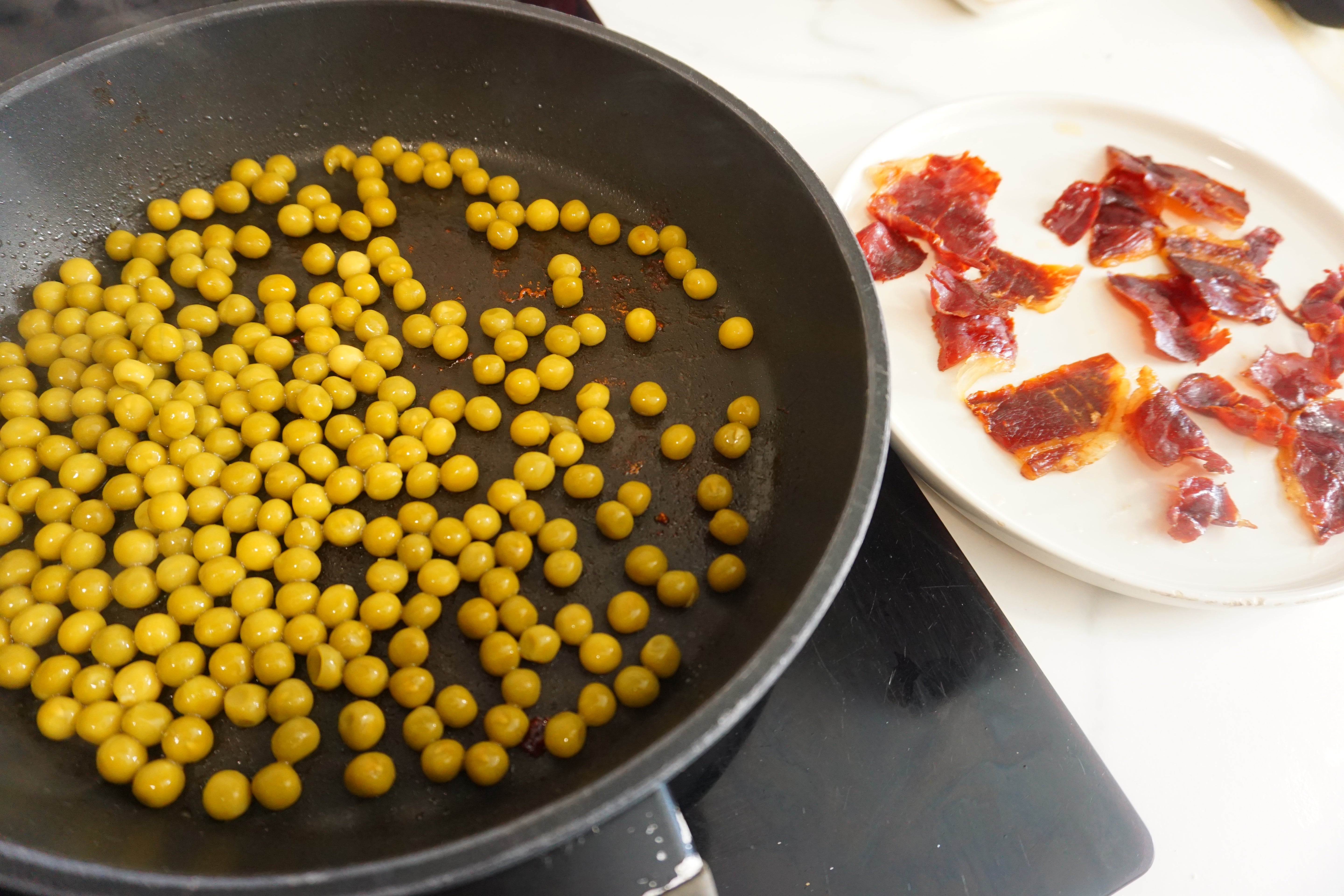 Ingredients for the peas with ham shavings and black truffle