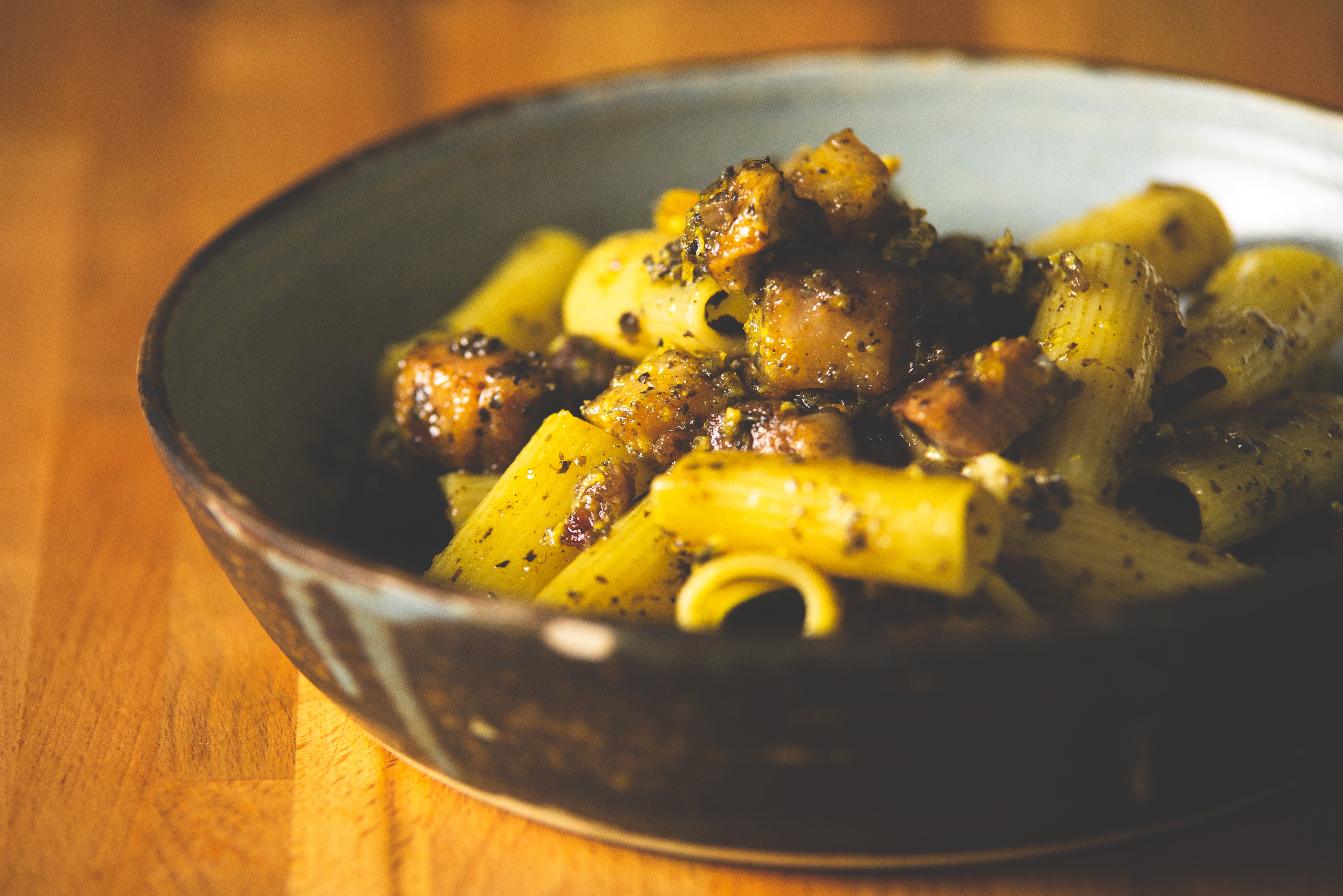 A modern twist on carbonara, elevated by the rich flavour of Laumont black truffle sauce. Al dente rigatoni combined with crispy pork belly and silky egg yolks create a creamy, indulgent pasta dish enhanced by tartufata.