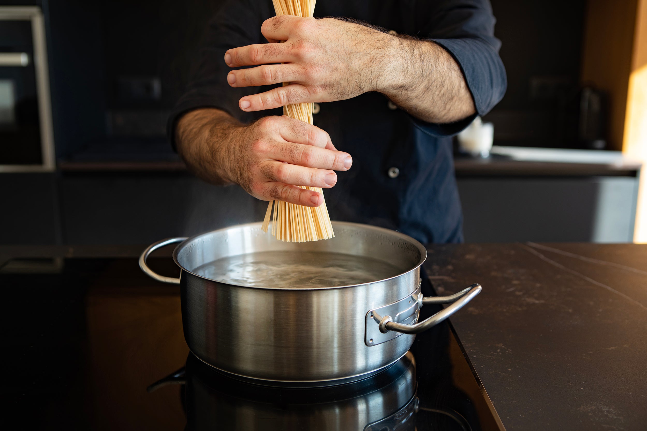 3. In a large pot, boil the spaghetti with a pinch of salt for the time indicated by the manufacturer.