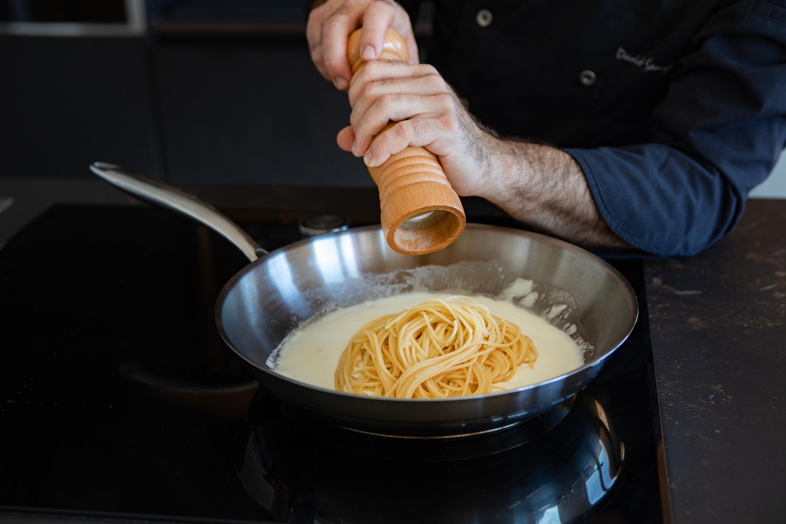 Step-by-step instructions for making cacio e pepe spaghetti with white truffle